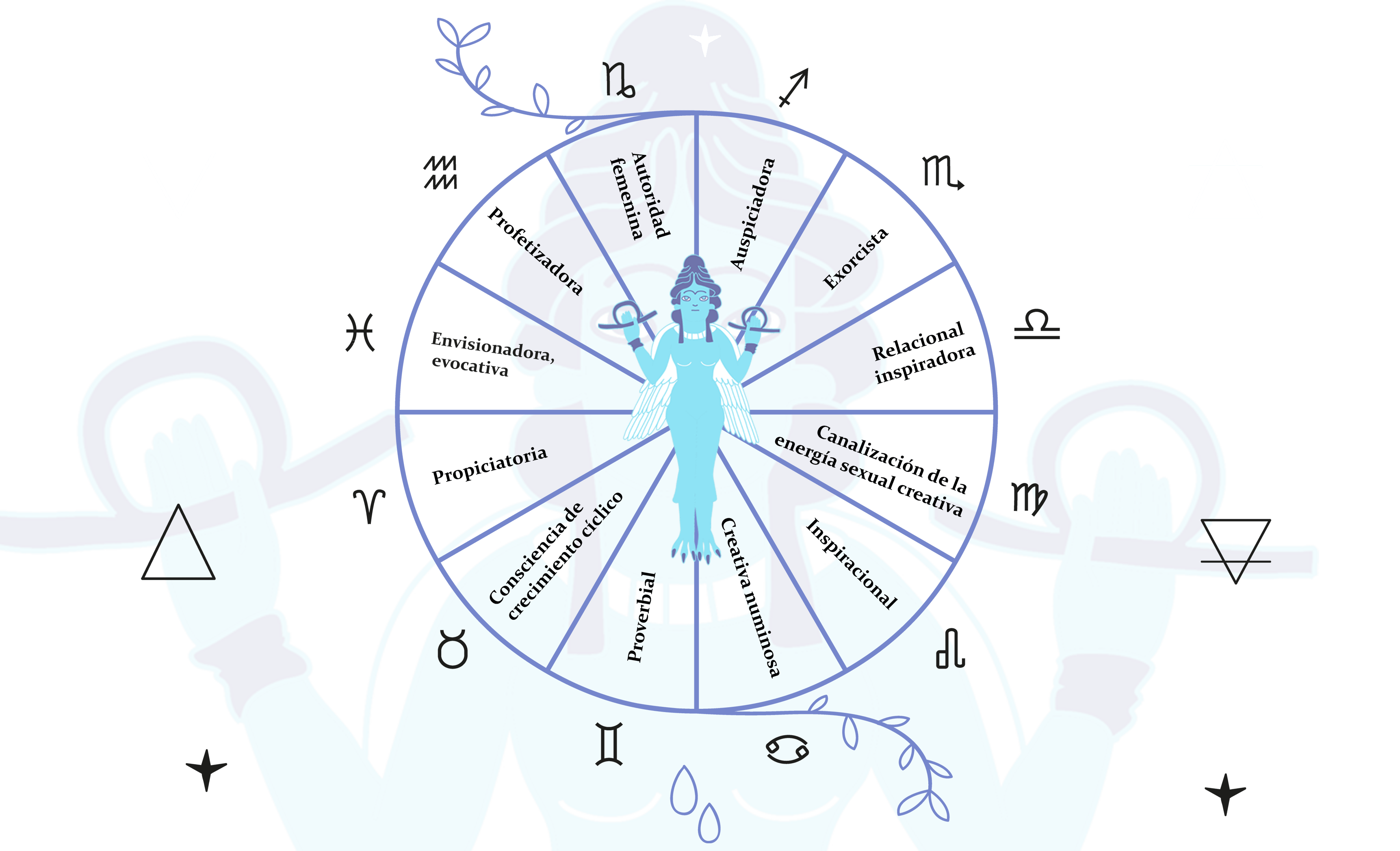 Aquí, esto se denomina las inteligencias femeninas, que son la resignificación de los signos astrológicos a través de asignarles una versión femenina a cada uno.